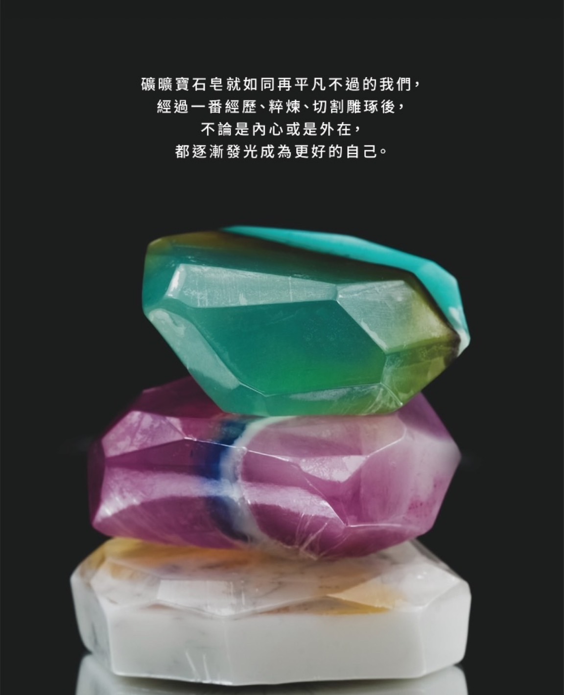 礦曠寶石皂就如同再平凡不過的我們,經過一番經歷、粹煉、切割雕琢後,不論是內心或是外在,都逐漸發光成為更好的自己。